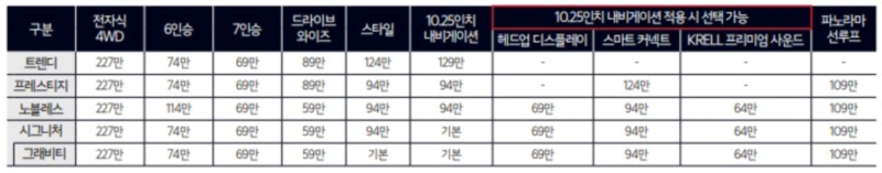 프레스티지 | 3,773만 친환경차 세제혜택 후 3,630만 |