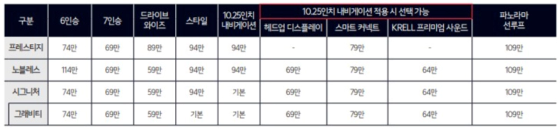 | 노블레스 | 4,055만 친환경차 세제혜택 후 3,912만 |